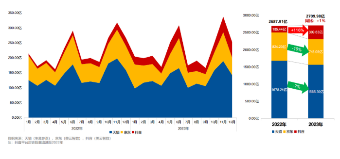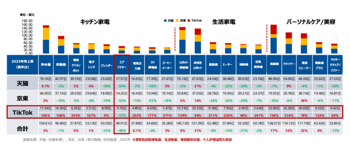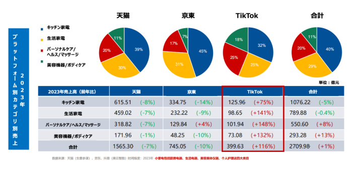小型家電の売り上げはECへの集中が顕著で、プラットフォーマー三社(天猫・京東・抖音)の売り上げの合計を100%とした場合、2023年の売上高の比率は天猫58%、京東27%、TikTok 15%でした。このうち天猫・京東は前年同期比マイナスとなっている一方で、TikTokでは同期比116%とプラスを記録、ECプラットフォームとしての存在感も確実に強めています。