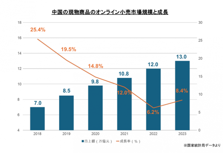 2023年、中国のオンライン小売額は13.0兆元(日本円換算:約260兆円、1中国元=20円換算)に達し、前年からの伸び率は8.4%でした。特にコロナ禍明けの2022年以降は伸び率が低下傾向にありますが、それまでは毎年継続して二桁成長を遂げてきました。市場自体は成長期から成熟期へと移行しつつあると言えますが、とはいえ市場全体の大きさがそもそも日本の約10倍、さらに潜在需要も依然として大きく、政府や大手のプラットフォームもさらなる発展を目指しています。(参考:2023年の日本のBtoC-EC(消費者向け電子商取引)市場規模は、24.8兆円(前年22.7兆円、前々年20.7兆円、前年比9.23%増)、経済産業省調べ)