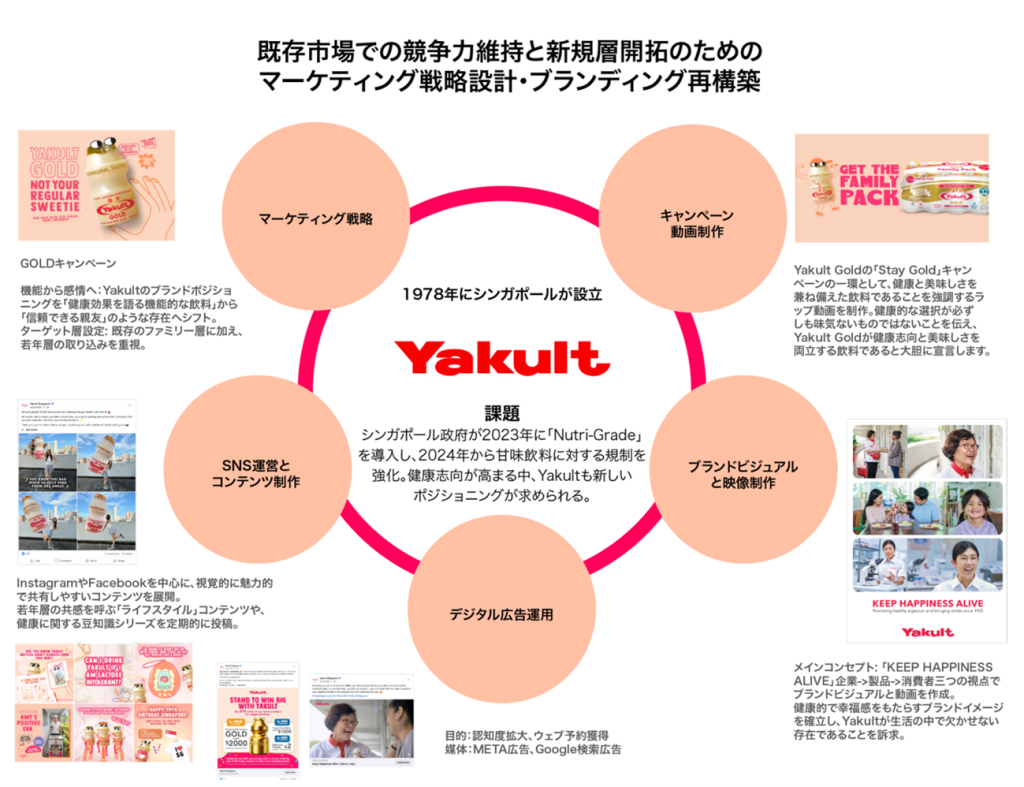 Yakult Singaporeさまはシンガポールの市場に入って45年の歴史をもつ、圧倒的な市場のリーダーです。政府の甘味飲料規制への対応、現地の競合商品に追いかけられる立場という環境の中で、当社では市場調査から、新たなマーケティング戦略立案、若年層の取り込みを図るべくソーシャルメディアを活用したキャンペーンの企画・実施、オウンドアカウントの運用、企業ブランディングのメッセージ開発、動画制作などをご支援しました。