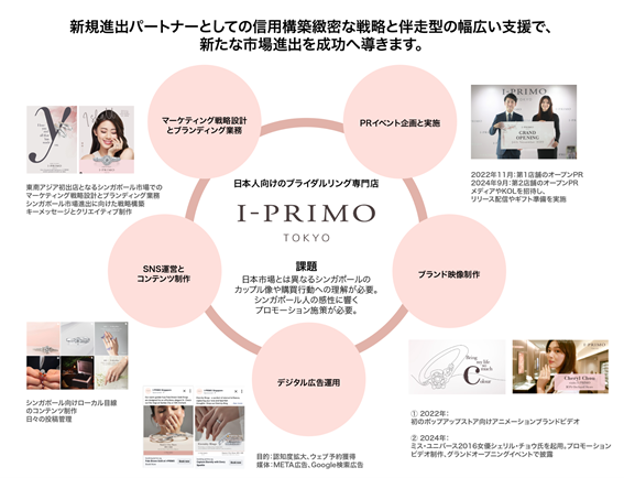 Primo Diamond Singaporeさまは、東アジアでの成功を基盤に、日本の高い品質やクラフトマンシップを東南アジアのウェディング市場に提案すべく、2022年に東南アジア1号店としてシンガポールに出店されました。当社では、現地におけるニーズ分析、ブランドのポジショニングやターゲット策定などのマーケティング戦略立案、PR、イベント展開、オンライン広告運用、ソーシャルメディアの企画、クリエイティブ制作、運用など、伴走型で全方向のマーケティング支援を実施しています。