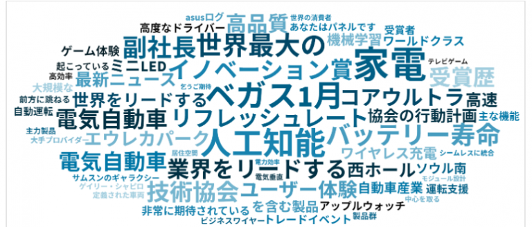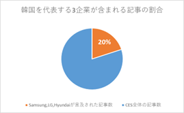 また、CES全体の記事のうち韓国を代表するメーカーSamsung , LG, Hyundaiが含まれる記事数は、約2割に上り、CESに関する記事の1/5で上記韓国企業が言及されているということになります。
