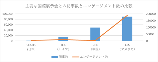 一方で、各社が多くの新製品・プロトタイプを出品するほか、事業に関する大きな発表をする企業も多く、今や世界最大のテックイベントとして各国のメディアからも大きな注目を集めています。開催前後の期間には記事やSNS上での投稿が一気に増加し、一般の方の目にも多く触れる大型イベントです。CESの注目度がいかに高いかを示すために、CESに類似する主要な電子機器関連の国際展示会の記事数やその記事についたエンゲージメント数を比較したグラフがこちらです。