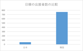 一方、国別でみると韓国勢がこのイベントに非常に注力していることが分かります。出展者数は日本の出展者が約50社に対し、韓国は760社と約15倍に至ります。