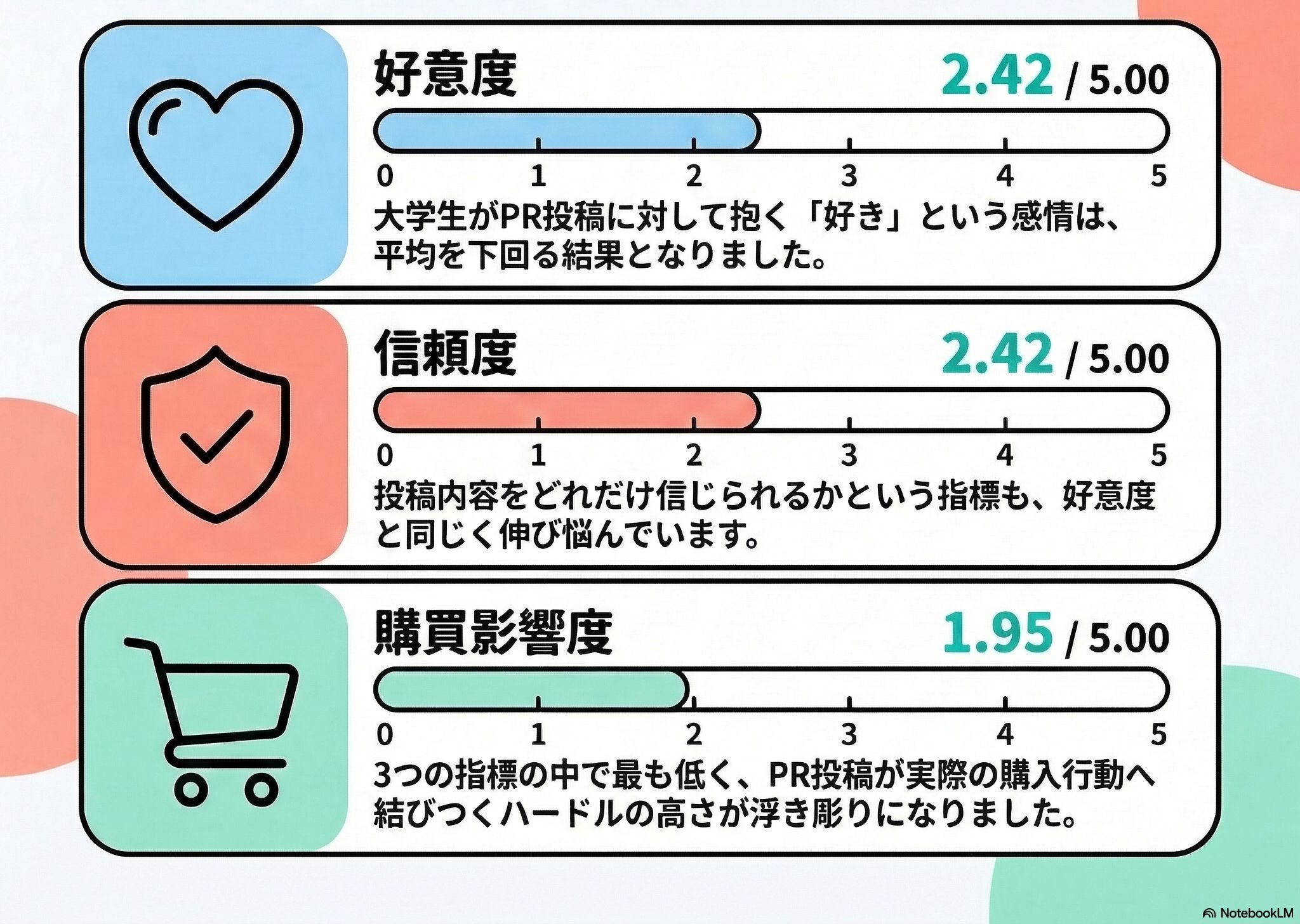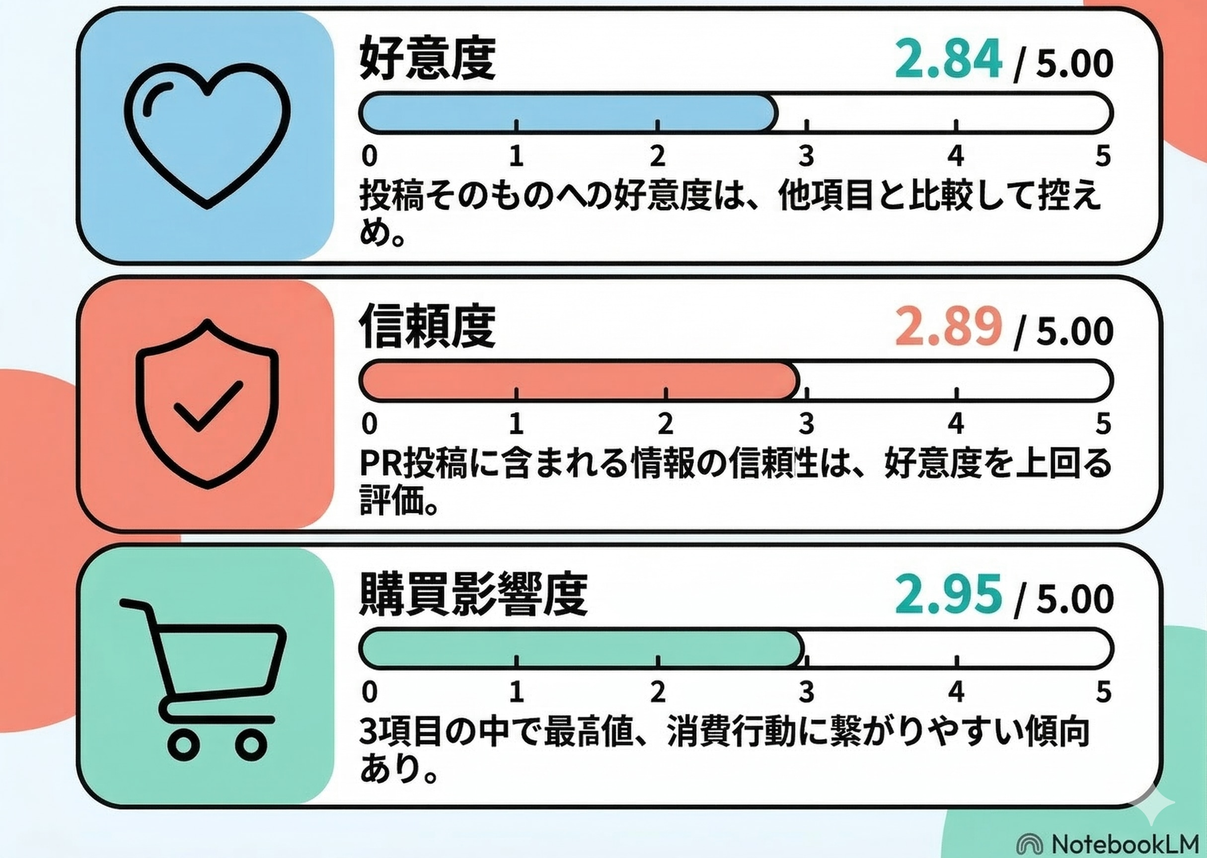 これは、InstagramのPR投稿が「強く信頼されているわけではない、しかし否定的に見られているわけでもない」という、比較的バランスの取れた評価であることを示しています。